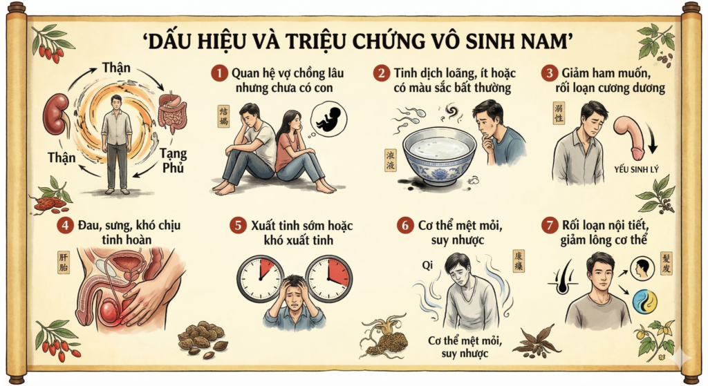Vô sinh nam thường liên quan đến tình trạng thận tinh suy, khí huyết hư hoặc rối loạn chức năng tạng phủ, từ đó ảnh hưởng đến khả năng sinh tinh và chất lượng tinh trùng. Bệnh lý này đôi khi không biểu hiện quá rõ ràng, nhưng nam giới vẫn có thể nhận thấy một số dấu hiệu bất thường trong sinh lý hoặc cơ quan sinh dục.