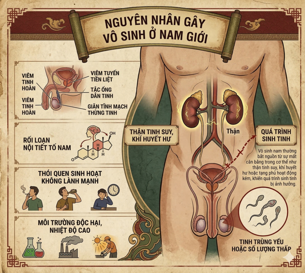 Vvô sinh nam thường bắt nguồn từ sự mất cân bằng trong cơ thể như thận tinh suy, khí huyết hư hoặc tạng phủ hoạt động kém, khiến quá trình sinh tinh bị ảnh hưởng. Ngoài ra, các yếu tố bệnh lý, lối sống và môi trường cũng có thể tác động đến chất lượng tinh trùng và khả năng sinh sản của nam giới.