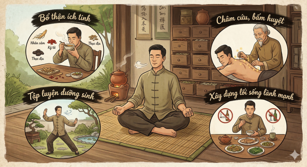 • Bổ thận ích tinh bằng các bài thuốc Nam hoặc thảo dược giúp tăng cường sinh tinh và cải thiện chất lượng tinh trùng.